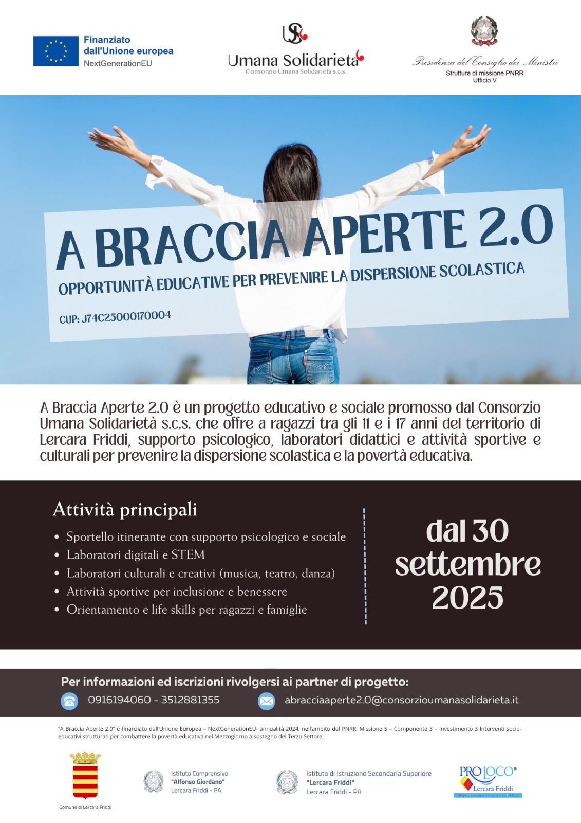 "A Braccia Aperte 2.0" è un progetto educativo e sociale promosso dal Consorzio Umana Solidarietà s.c.s., in partenariato con il Comune di Lercara Friddi, l'Istituto di Istruzione Secondaria Superiore "Lercara Friddi", l'Istituto Comprensivo "A. Giordano" e la Pro Loco Lercara Friddi, che offre a ragazzi tra gli 11 e i 17 anni, supporto psicologico, laboratori didattici, attività sportive e culturali per prevenire la dispersione scolastica e la povertà educativa.